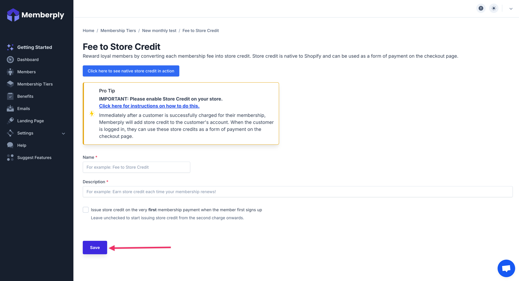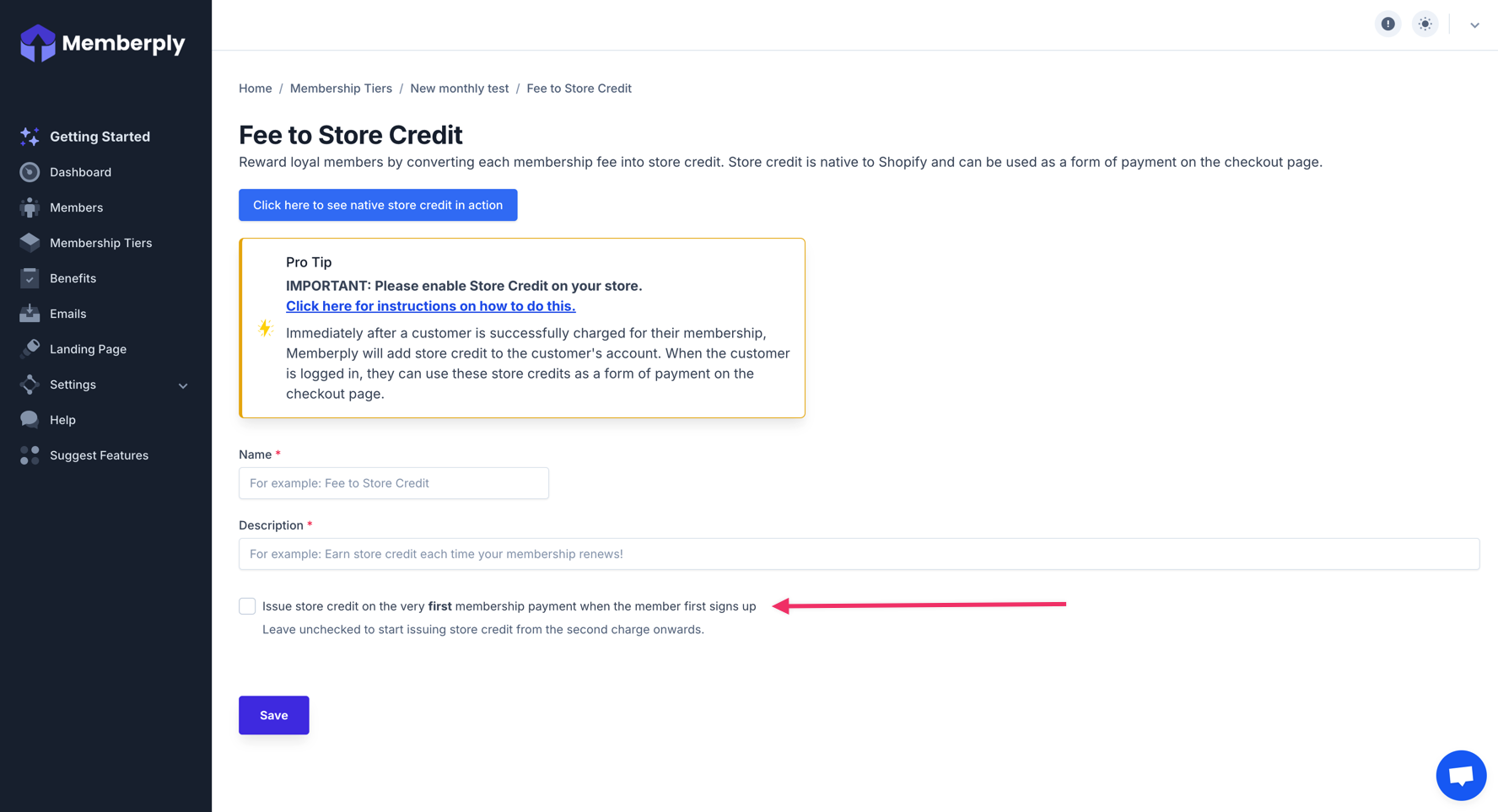 7. If you would like to issue store credit on the very first membership payment when the member first signs up, then check this box. Otherwise if you leave this unchecked, the first store credit issued will be from the second charge onwards.