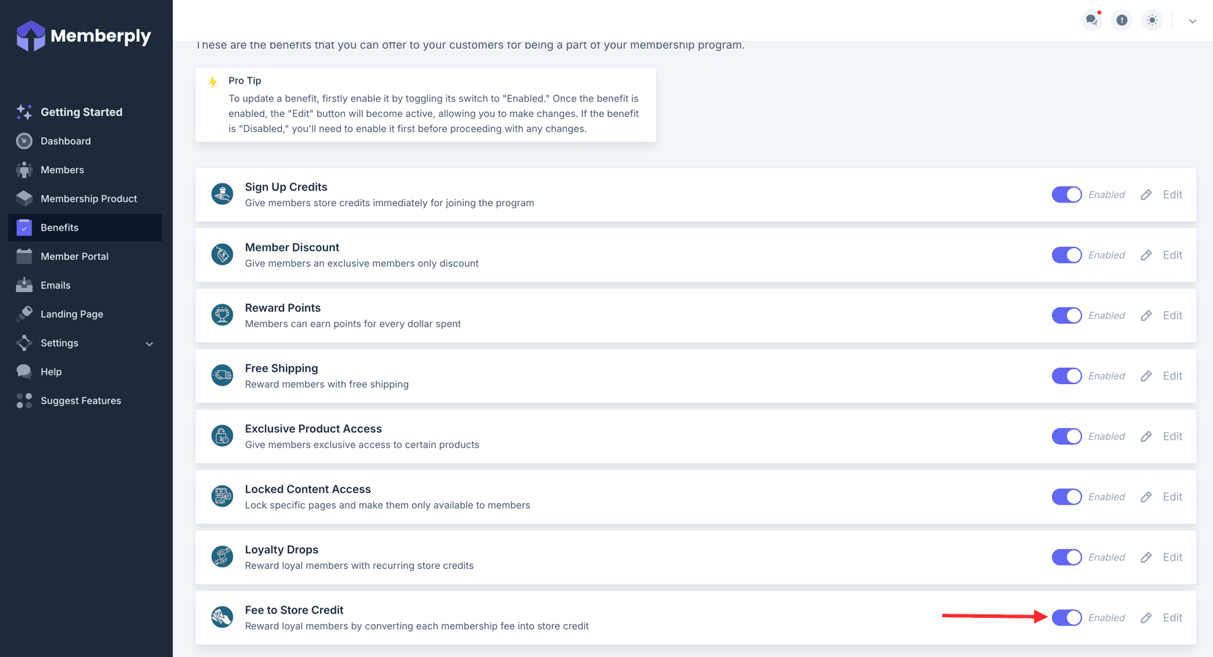 3. Next find the Fee to Store Credit row and then toggle the Fee to Store Credit benefit to Enabled.