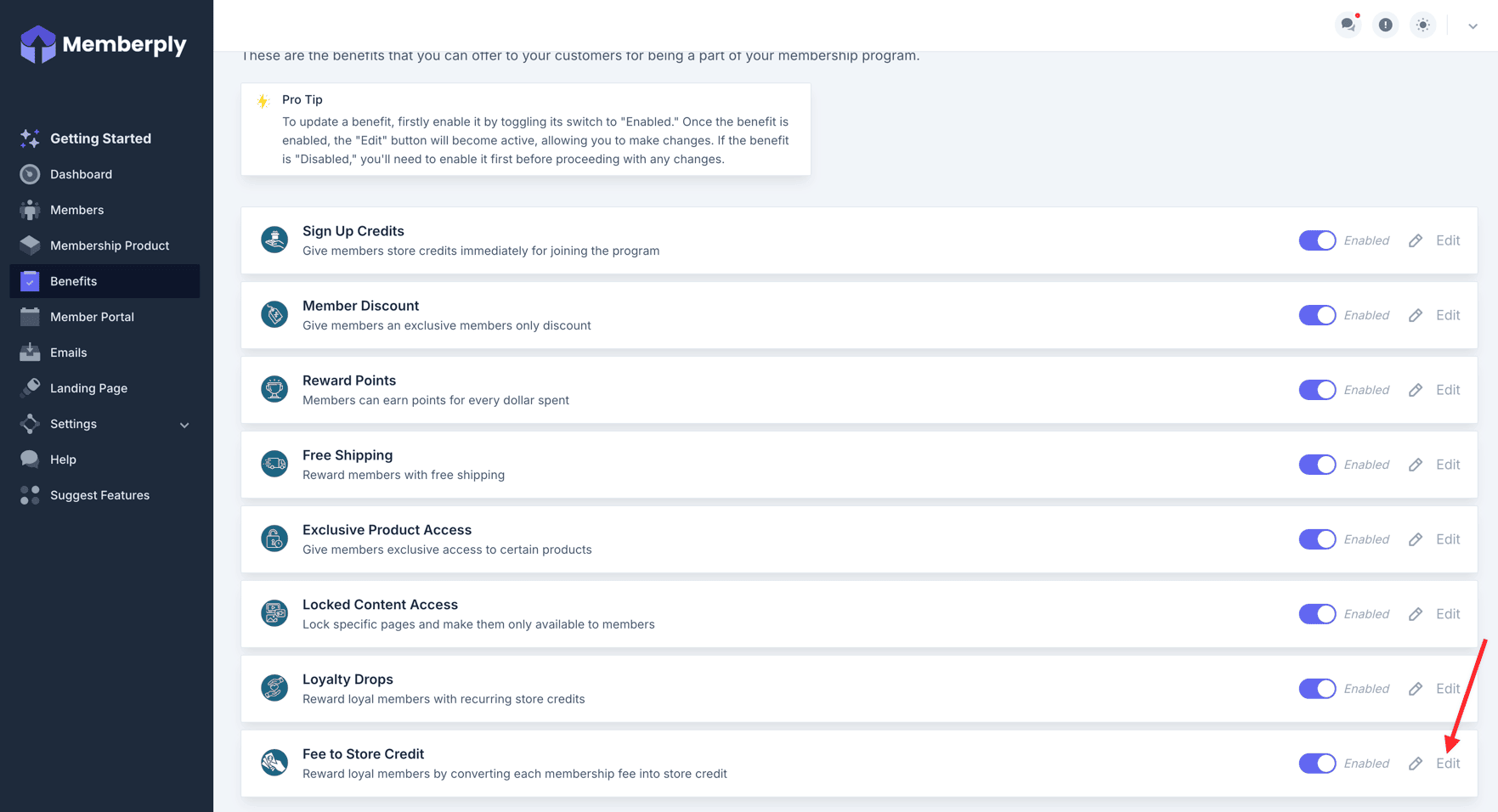 2. Next find the membership tier you want to add this benefit to and click on the Edit Benefits button.