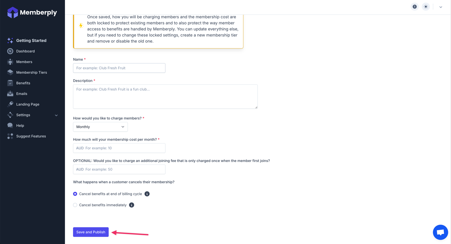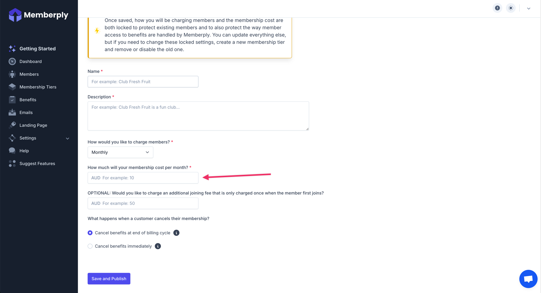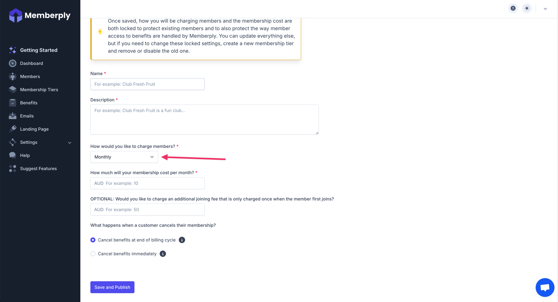 NOTE: Once the Save and Publish button has been clicked, how you will be charging members is locked to protect existing members. You can update everything else, but if you need to change this locked setting, you will have to create a new membership tier and remove or disable the old one.