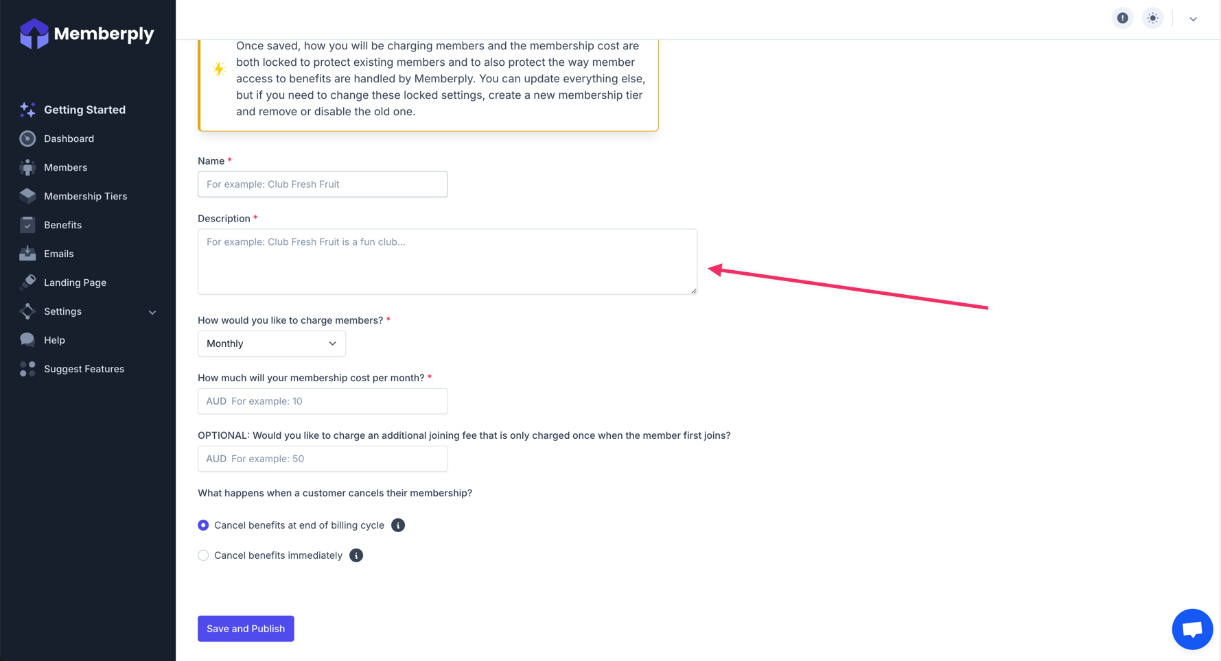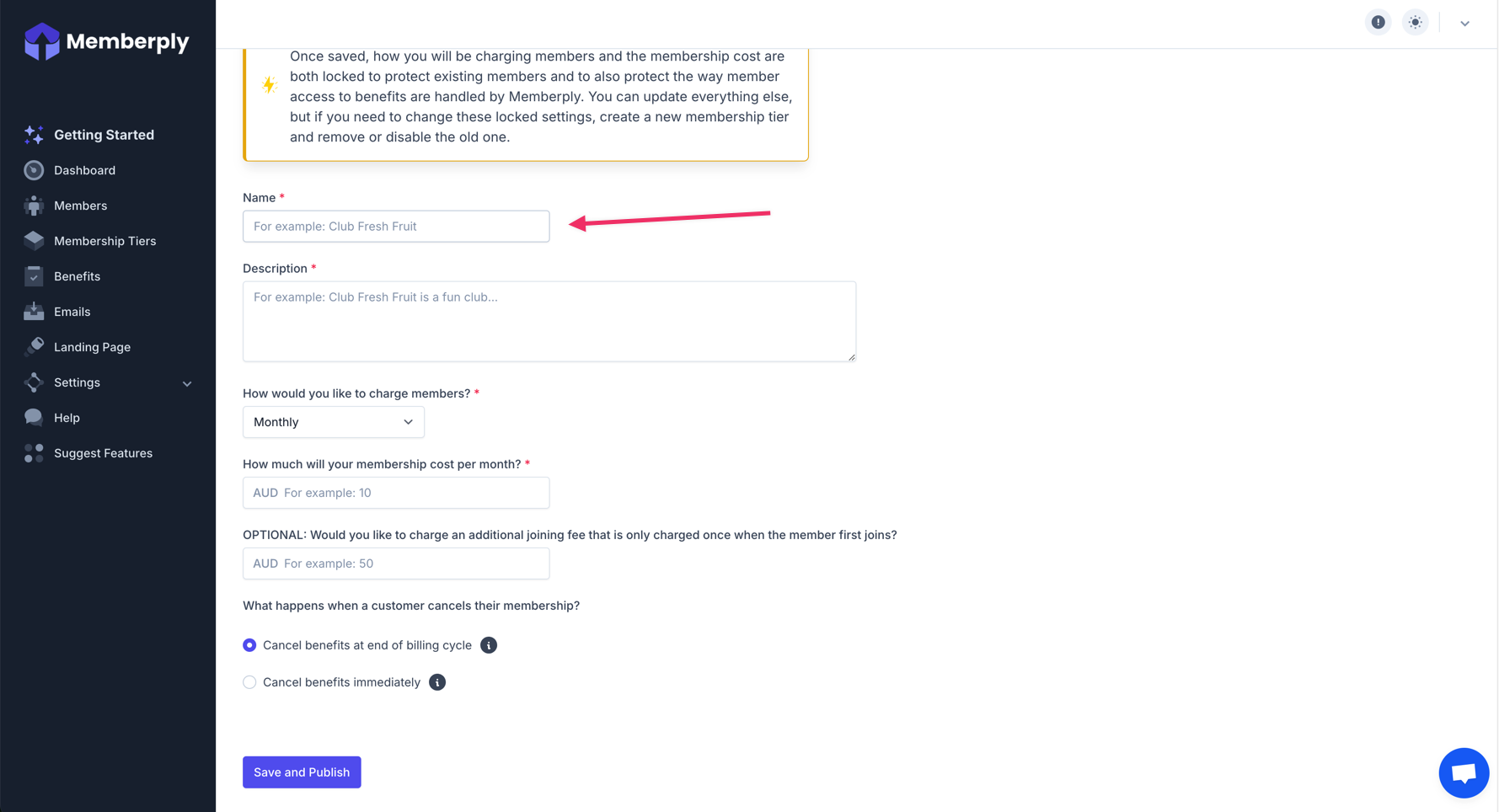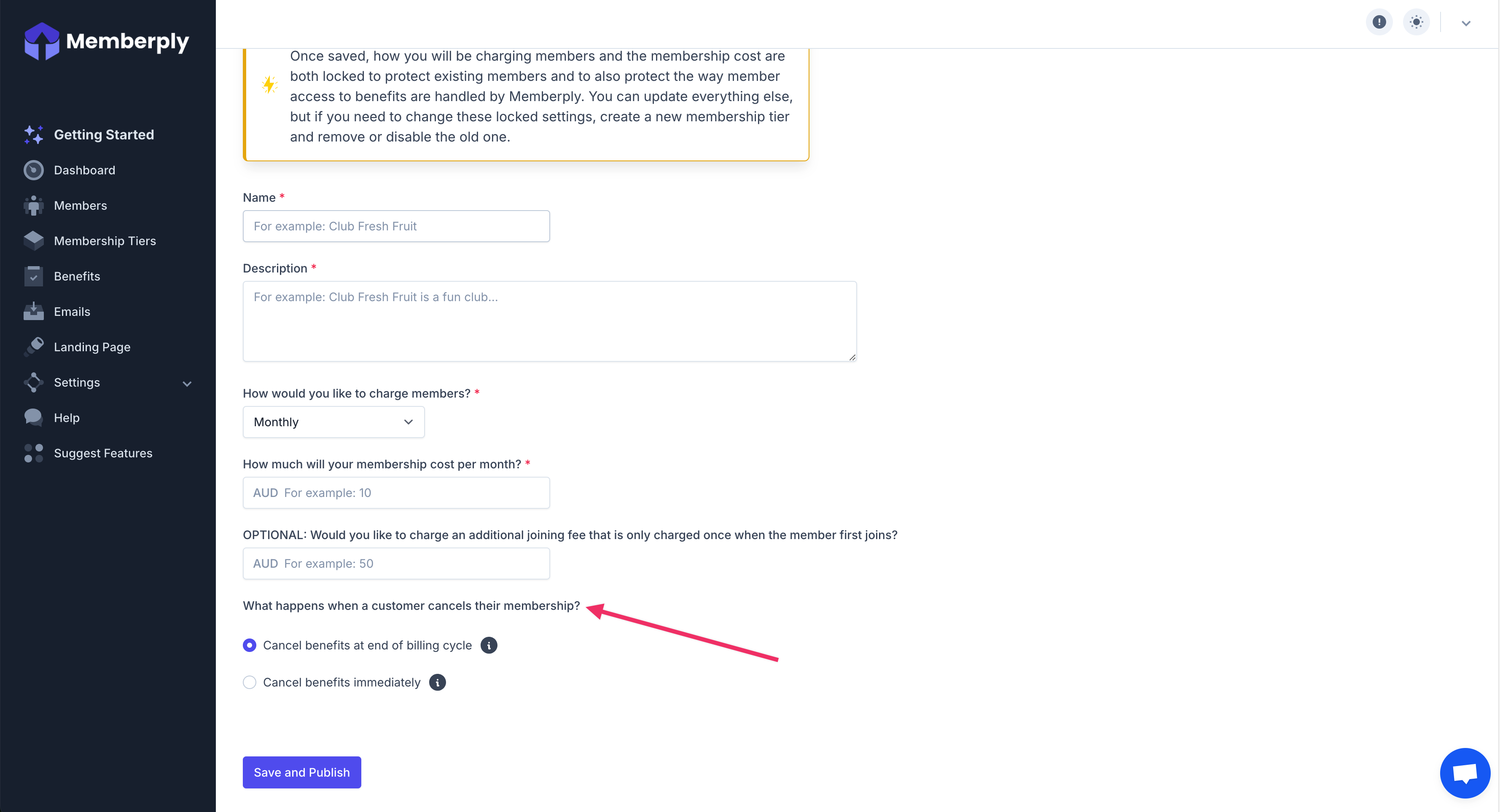 NOTE: Once the Save and Publish button has been clicked, how you will be charging members is locked to protect existing members. You can update everything else, but if you need to change this locked setting, you will have to create a new membership tier and remove or disable the old one.