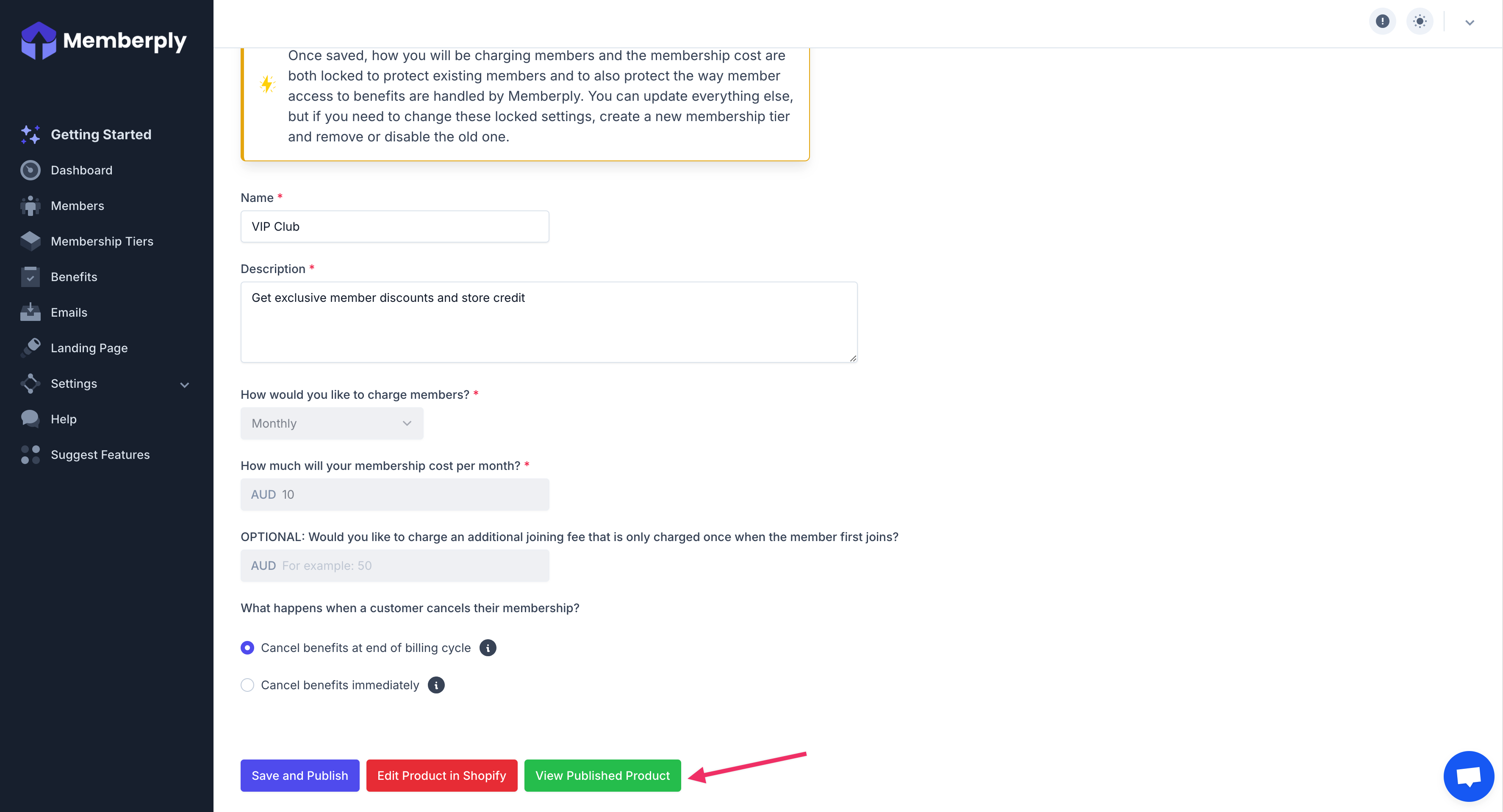 10. Once you have saved your membership tier, a button will now appear where you can view the membership tier product on your store. Click on this View Published Product button to see your product in action.