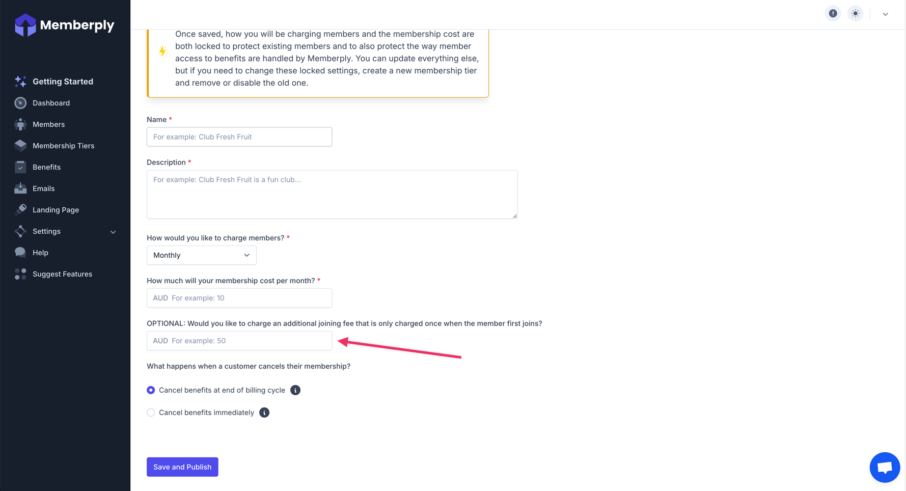 7. OPTIONAL: You can also charge an additional joining fee on top of the membership cost. This is purely optional and is only charged once when the member first joins, on top of the membership cost.